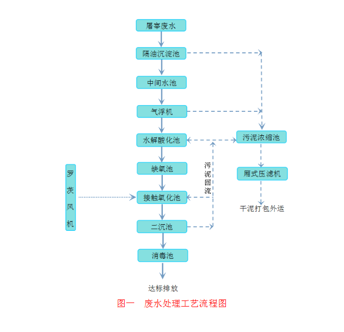 由于屠宰廢水中還含有定量的血污和油脂,因此我們選擇同時(shí)去除油脂和懸浮物隔油沉淀作為預(yù)處理,然后采用氣浮進(jìn)行再次處理。實(shí)踐表明,預(yù)處理過(guò)程中投加絮凝劑去除污染物時(shí),并不是投加絮凝劑品種越多、投加藥劑量越大,去除效果越好,只需在污水處理中有針對(duì)性地適量加入混凝藥劑,投加量保持在一定量(微量)的情況下,污染物去除效果良好,這就是選擇性物化技術(shù),這種技術(shù)有利于節(jié)省藥劑費(fèi)用和降低物化污泥量。
