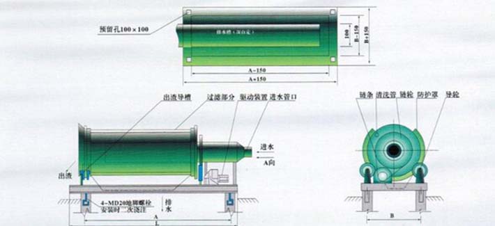 處理水從水管進入溢流堰布水器,經(jīng)短暫穩(wěn)流后,由出水口均勻溢出,分布在反方向旋轉(zhuǎn)的濾筒濾網(wǎng)上,水流與濾筒內(nèi)壁產(chǎn)生相對剪切運動,過水效率高,固形物被截流分離,順著筒內(nèi)螺旋導(dǎo)向板翻滾,由濾筒另一端排出。濾液從水槽中流走。該機濾筒外配有沖洗水管,沖洗水壓力(3kg/㎝2),呈扇形噴射以沖洗疏通濾網(wǎng),保證濾網(wǎng)始終保持良好的過濾能力。